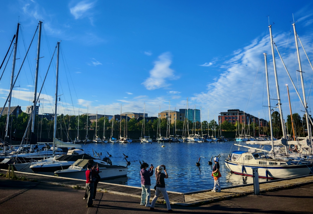 哥本哈根河面上最是热闹。运河中木船桅杆轻摇,白帆船挤挤挨挨,有的静静泊在岸边,船身映着云影,像把天空裁了块铺在船上;有的载着游人缓缓行着,船舷边不时溅起细碎的水花,混着船上的笑声飘过来,脆生生的,落进水里都像会响。两岸的房子更有意思,不似寻常城市的单调,红的、黄的、粉的墙在阳光下亮得活泼,像孩童打翻了调色盘,又被细心摆得错落有致;间或有几栋高楼,玻璃幕墙映着河光,倒像是把河水又搬上了半空,上下都是蓝,分不清虚实。